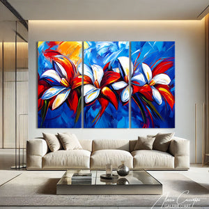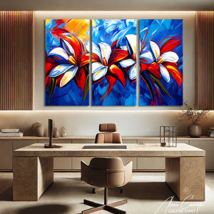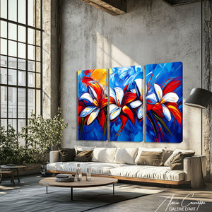 Notre tableau 3 parties fleurs déploie des formes florales artistiques aux couleurs délicates. Une composition douce et poétique qui illumine vos murs. Un tableau décoratif qui respire élégance et nature. Une création intemporelle qui séduit par son raffinement.