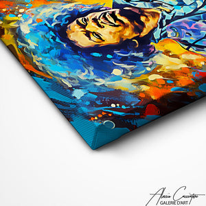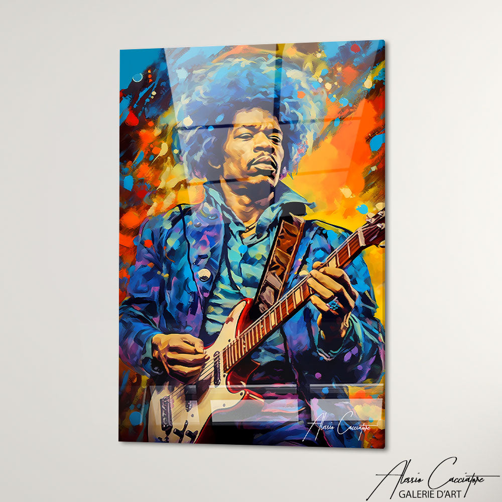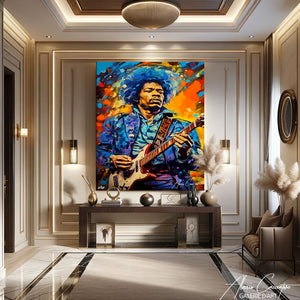 Notre tableau rend hommage à Jimi Hendrix, sa guitare à la main, dans un style vivant mêlant énergie électrique et touches pop art. Les couleurs audacieuses traduisent toute l’intensité de sa musique et de sa présence scénique. Parfait pour une déco musicale et rebelle. Ce tableau incarne le mythe et l’âme du rock avec puissance.