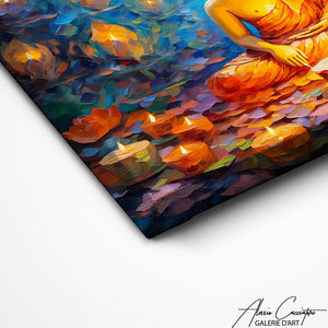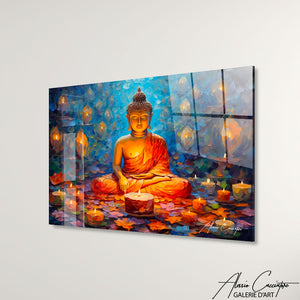 Notre tableau représente un Bouddha assis paisiblement, entouré de bougies allumées qui diffusent une lumière douce et apaisante. L’ambiance zen et spirituelle invite à la détente et à la méditation. Parfait pour une pièce de repos ou un coin bien-être. Ce tableau crée une atmosphère sacrée et réconfortante.