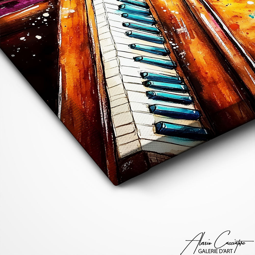 Notre tableau décoratif musique célèbre l’art et la passion à travers un piano baigné de couleurs éclatantes. Les notes flottant autour de l’instrument symbolisent la créativité et la liberté artistique. Parfait pour les amateurs de musique et d’art, il ajoute une touche expressive à tout intérieur.