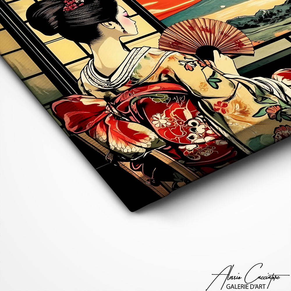 Notre tableau paysage japonais capture l’essence du pays du Soleil-Levant avec une scène pleine de grâce et de tradition. Une femme en kimono contemple le Mont Fuji au coucher du soleil, entourée de fleurs de cerisier. Les teintes rouge-orangé et les détails raffinés créent une atmosphère poétique et contemplative. Réalisée sur toile premium, notre œuvre est parfaite pour insuffler une touche japonaise et élégante à votre intérieur.