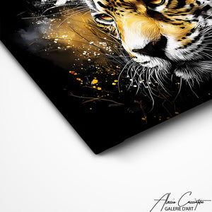 Notre tableau léopard déco dévoile le portrait d’un léopard au regard intense, mis en valeur par des contrastes noirs et dorés éclatants. Les éclaboussures artistiques et les textures dynamiques créent une composition moderne et élégante. Le regard perçant du félin apporte force et caractère à l’ensemble. Une décoration murale idéale pour donner une touche sauvage et raffinée à votre intérieur.