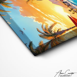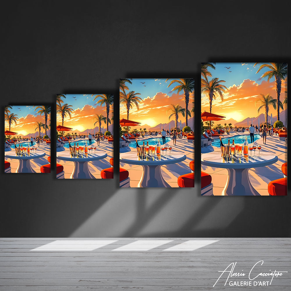 Notre tableau paysage mid century capture l’élégance intemporelle d’un coucher de soleil sur fond de palmiers et de verre scintillant. L’ambiance luxueuse d’une soirée d’été se mêle à des tons dorés et orangés, créant une atmosphère à la fois chaleureuse et raffinée. Idéale pour une décoration contemporaine, cette œuvre évoque les vacances, la convivialité et l’art de vivre. Imprimée sur toile premium, elle apporte lumière et sophistication à votre intérieur.
