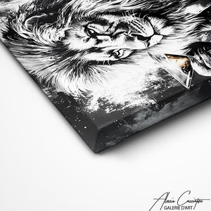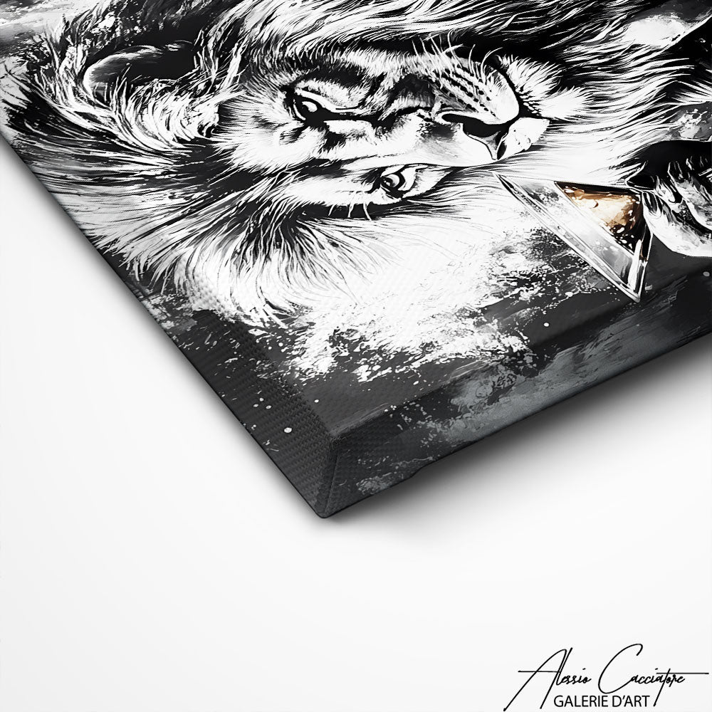 Notre Tableau Mafia Lion impose une présence forte et charismatique avec son lion majestueux assis en costume sombre, tenant un verre comme un chef influent. Les nuances noir et blanc, enrichies de textures profondes, donnent un rendu puissant et dramatique qui attire immédiatement le regard. Son style affirmé transforme n’importe quel mur en espace sophistiqué et audacieux.