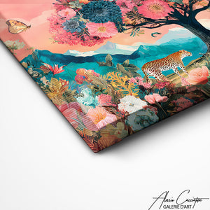 Notre tableau arbre rose illumine un arbre floral avec animaux de la savane ! Cette œuvre tendre transforme votre espace en jardin animalier artistique. Les tons roses apportent douceur et chaleur à cette scène africaine. L'art floral animalier qui enchante petits et grands !