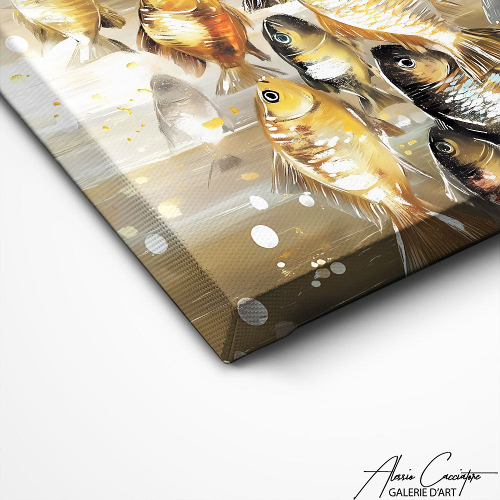 Notre tableau avec des poissons dévoile un banc aquatique en pleine harmonie. Les nuances dorées, cuivrées et argentées s’entremêlent dans un mouvement fluide et élégant. Cette composition évoque la cohésion, l’énergie et la beauté du monde sous-marin. Une création captivante qui diffuse calme et équilibre dans tout espace de vie.
