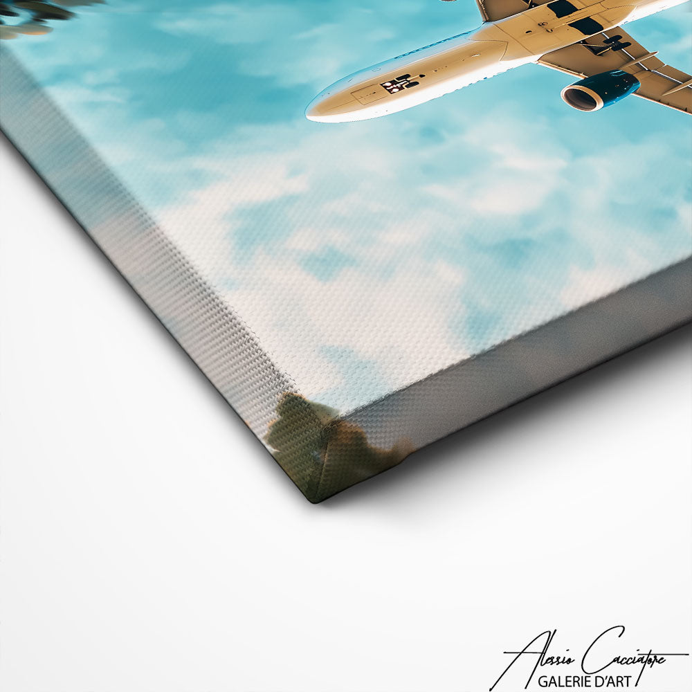 Notre tableau capture un avion vu du dessous, traversant un ciel bleu parsemé de nuages. La perspective renforce l’impression de mouvement et de hauteur. L’image évoque le voyage, le départ et l’envie d’horizons lointains. La composition épurée met en valeur la puissance et l’élégance de l’appareil. Un visuel inspirant pour les amateurs d’aviation et d’évasion.