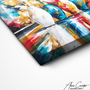 Notre tableau représente une scène dynamique de bowling avec des couleurs éclatantes et un effet de mouvement captivant. L’énergie visuelle attire immédiatement le regard et donne du caractère à votre décoration.