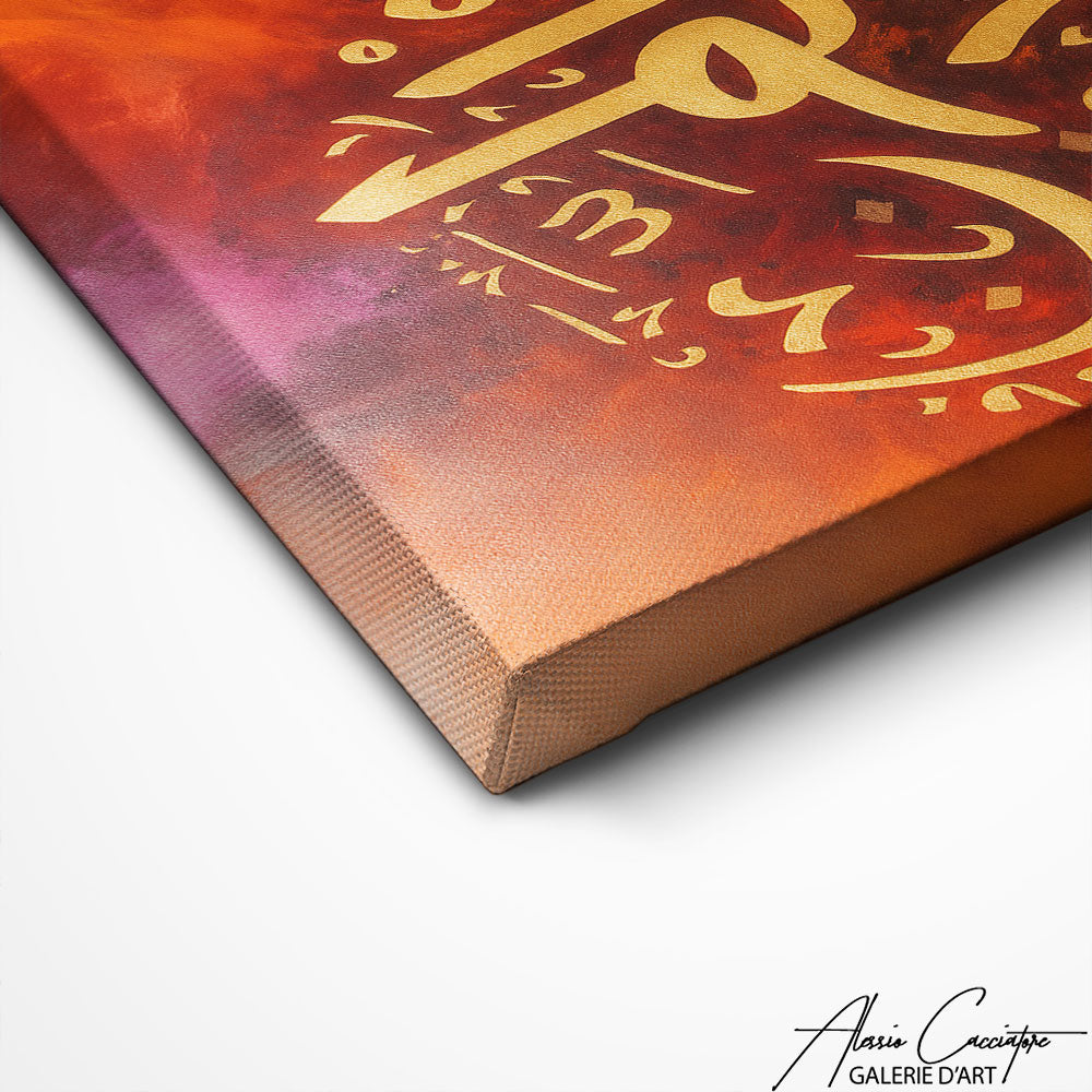 Notre tableau Calligraphie Arabe Abstrait marie intensité des couleurs et finesse des lettres pour offrir une œuvre décorative au caractère incomparable. Les tons rouges, orangés et pourpres créent un fond expressif, tandis que la calligraphie dorée apporte une dimension spirituelle forte. Ce modèle est parfait pour apporter du caractère à un salon, un bureau ou une pièce de méditation grâce à sa présence visuelle unique.