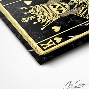 Notre tableau revisite la carte du roi dans un style luxueux noir et or avec un effet marbré élégant. Les lignes précises et les contrastes apportent une sensation de puissance et de prestige. La composition graphique attire immédiatement le regard. Parfait pour un intérieur sophistiqué et moderne.
