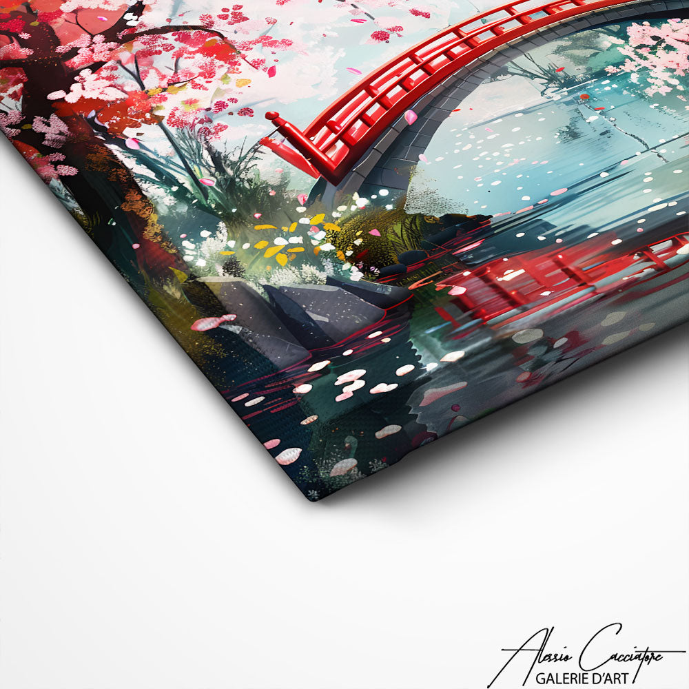 Notre tableau Cerisier du Japon vous plonge dans un décor féerique : un pont japonais entouré de fleurs de cerisier et d’un ruisseau apaisant. Une toile parfaite pour une ambiance poétique et contemplative. Parfait pour sublimer un salon ou une chambre zen.