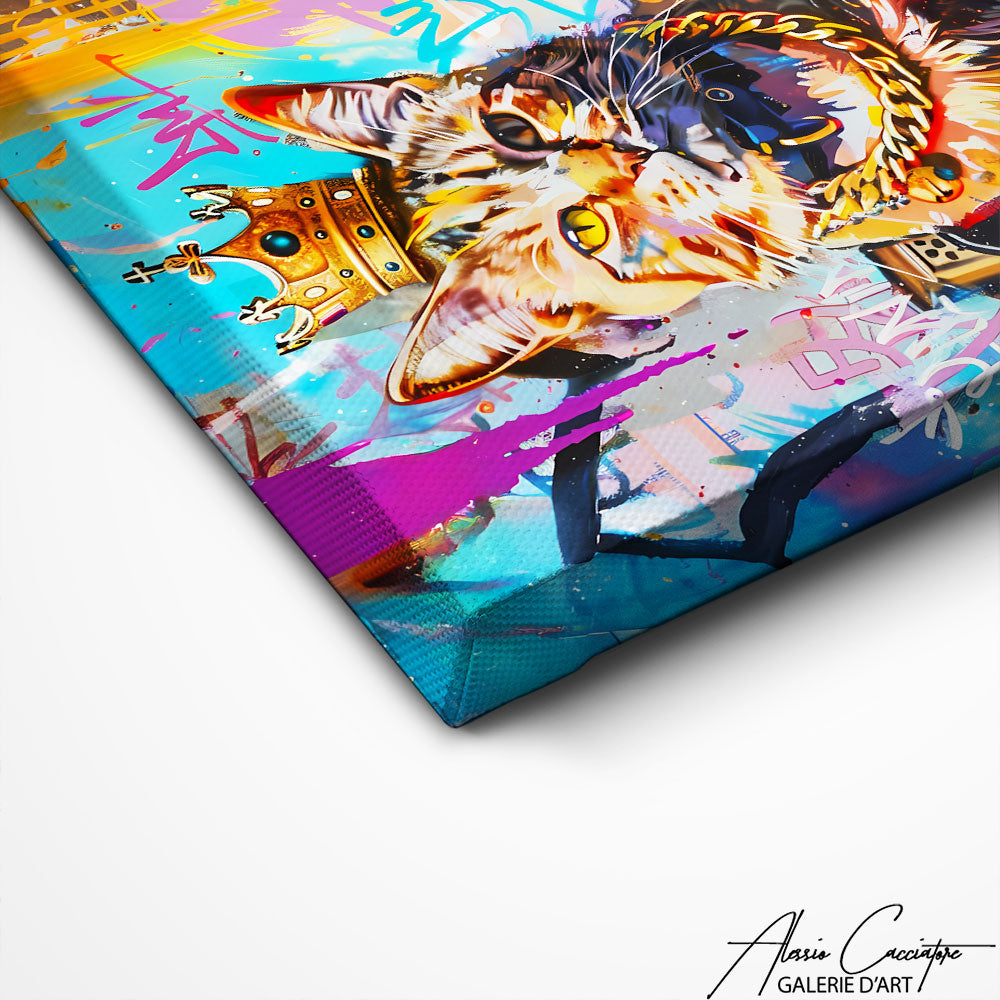 Notre tableau chat couronne révèle un félin street art au look de gangster, couronne dorée sur la tête. Parfait pour injecter de la personnalité et un brin d’ironie dans un intérieur urbain et tendance. Ce tableau impose une présence graphique forte et pleine d’audace.