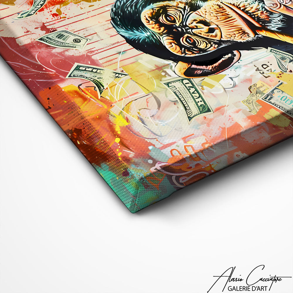 Notre tableau chimpanzé met en scène un singe élégant en costume, cigare au bec et billets à la main. Une œuvre décalée et luxueuse, parfaite pour une déco pleine de caractère et de second degré. Un clin d’œil humoristique et chic qui ne laisse personne indifférent.