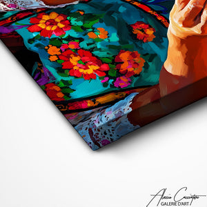 Notre tableau cuisine mexicaine capture un moment de partage et de tradition : la préparation du pain artisanal entouré de fleurs colorées. Une scène vivante et chaleureuse qui célèbre la culture culinaire du Mexique. Idéal pour décorer une cuisine ou une salle à manger, il inspire convivialité et authenticité.
