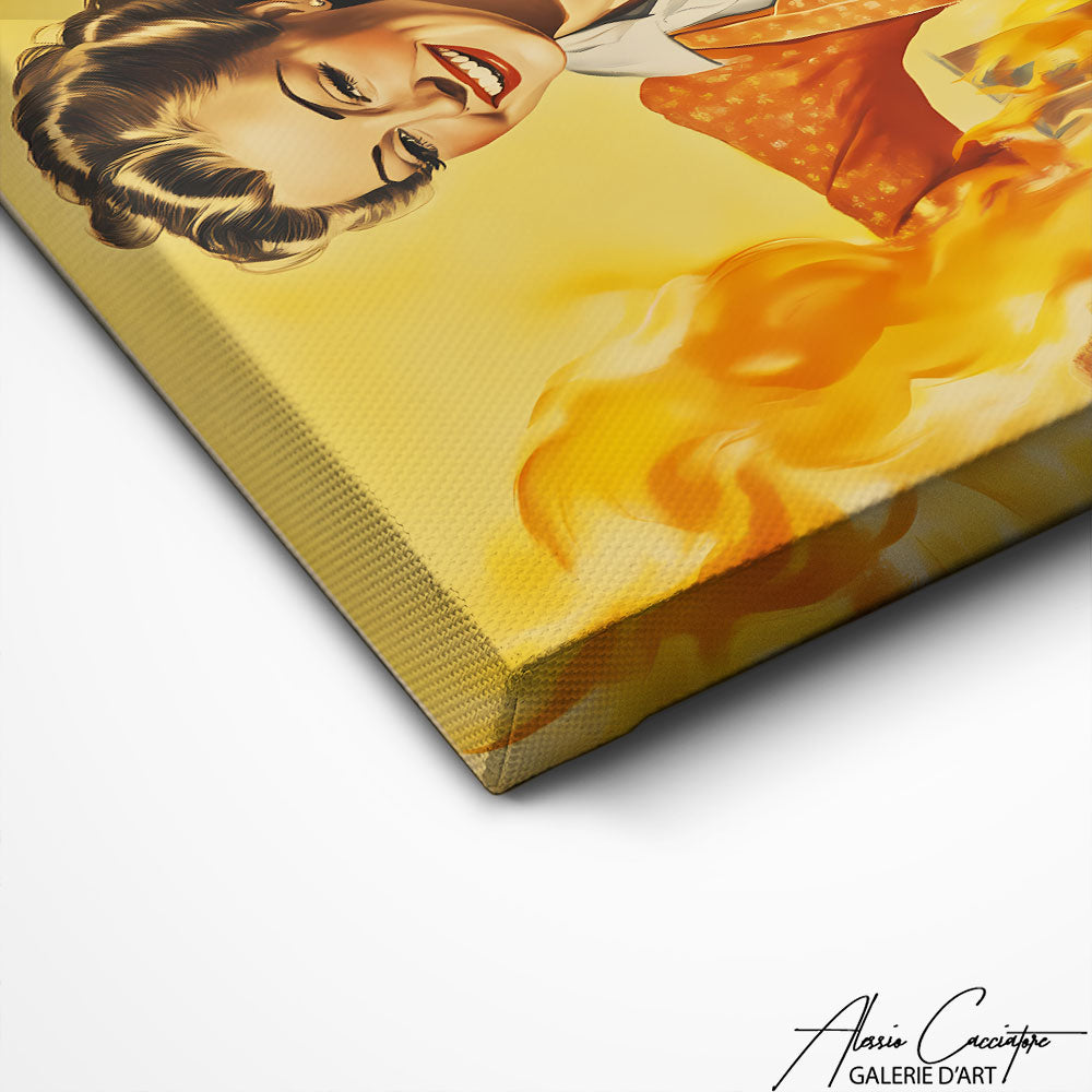 Notre tableau illustre une cuisinière souriante en train de préparer un plat flambé, dans un style rétro très marqué. Les couleurs chaudes et l’énergie de la scène donnent une touche joyeuse et pleine de caractère à votre décoration. Idéal pour une cuisine ou une ambiance vintage affirmée. Une pièce décorative audacieuse qui attire immédiatement l'attention.