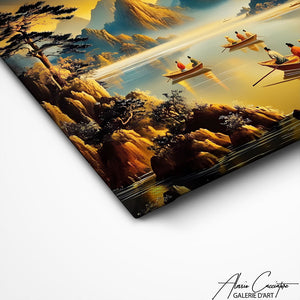 Notre tableau déco japandi transporte le spectateur dans un univers de quiétude et de contemplation. Les montagnes dorées et les barques paisibles sur l’eau évoquent une scène traditionnelle orientale sous la lueur du crépuscule. L’harmonie des tons or et bleu nuit offre une atmosphère chaleureuse et méditative. Imprimée sur toile de qualité supérieure, cette œuvre s’intègre parfaitement dans un salon zen ou un espace de détente raffiné.