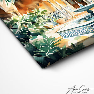 Notre tableau décoratif Marrakech évoque la beauté intemporelle des palais orientaux et des patios marocains. Entre jeux de lumière et mosaïques raffinées, il transporte instantanément vers une ambiance de sérénité et de luxe. Idéal pour une décoration élégante et dépaysante.