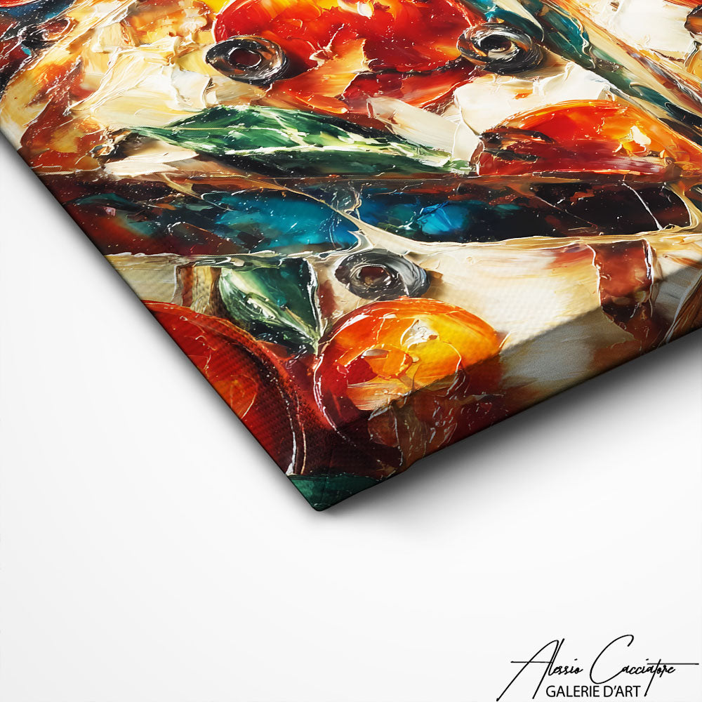 Notre tableau decoration cuisine révèle une pizza abstraite colorée ! Cette œuvre culinaire transforme votre cuisine en galerie d'art gastronomique moderne. L'art italien sublimé par l'abstraction contemporaine appétissante et stylée. L'art culinaire qui stimule créativité et gourmandise