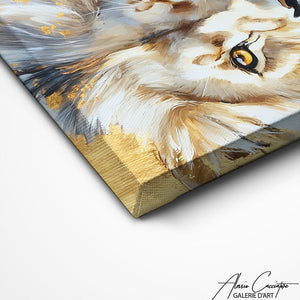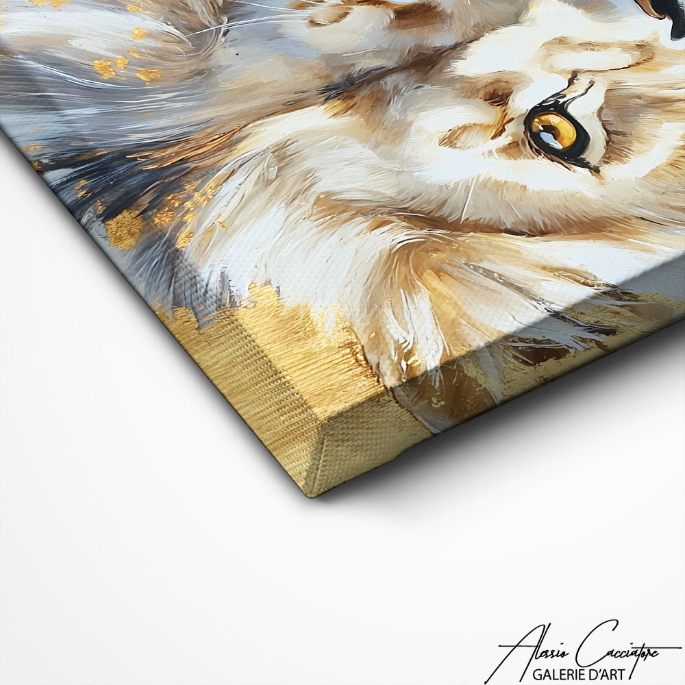 Notre tableau lion doré et blanc joue sur la pureté du contraste entre éclat et légèreté. Les reflets dorés illuminent le blanc immaculé, créant une ambiance paisible et luxueuse. Parfait pour un salon moderne ou une chambre zen, il incarne l’élégance sobre et contemporaine.