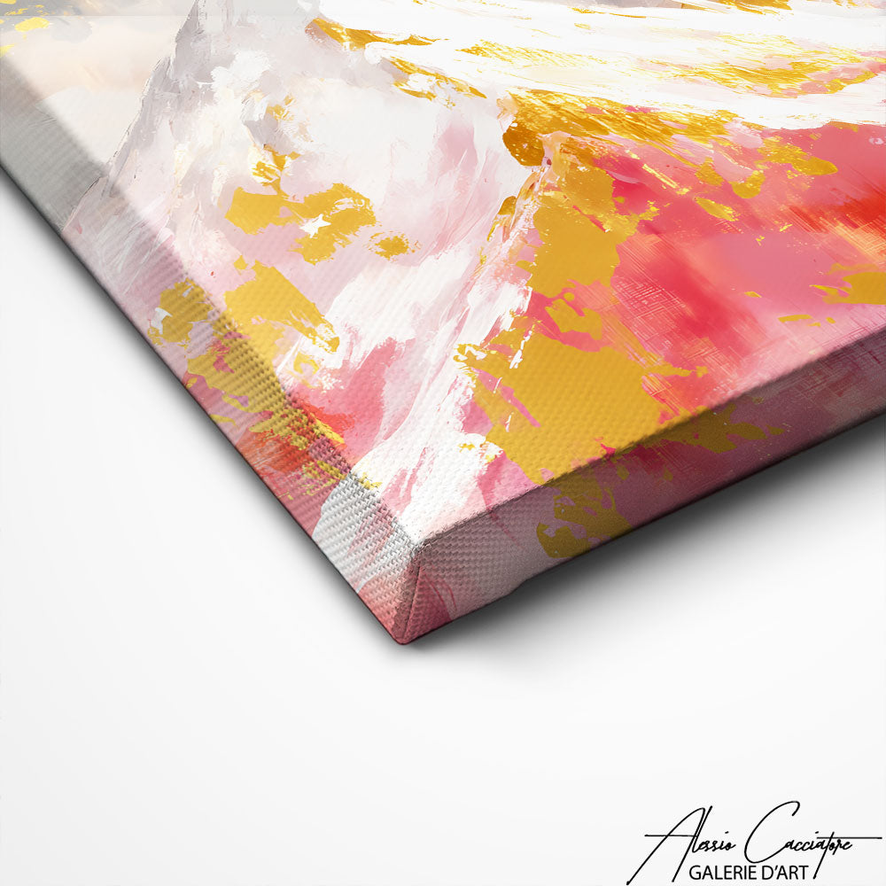Notre tableau aux nuances de rose et d’or illumine la pièce où il est exposé. Les montagnes dorées se fondent dans des tons doux et lumineux, évoquant un lever de soleil paisible. Idéal pour créer une ambiance chaleureuse et raffinée, il s’intègre harmonieusement à tous les styles de décoration.
