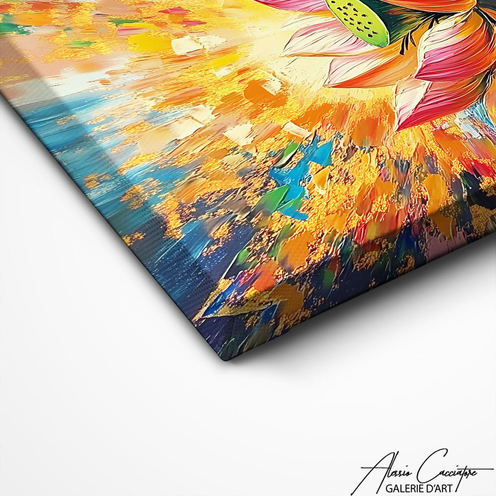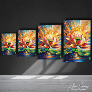 Notre tableau fleur de lotus explose de couleurs et de lumière dans une scène pleine de vitalité. Le lotus rouge et or s’épanouit au cœur d’un décor éclatant, symbole d’énergie positive et de renouveau. Idéal pour dynamiser un salon ou une chambre zen, ce tableau séduit par son intensité et sa profondeur. Réalisé sur toile haut de gamme, il allie éclat visuel et excellence artisanale.