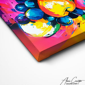 Notre tableau fruits pour cuisine explose de fruits pop art ! Cette œuvre vitaminée transforme votre espace culinaire en galerie d'art nutritive colorée. L'art pop sublime ces délices naturels avec énergie communicative. L'art alimentaire qui stimule l'appétit créatif !