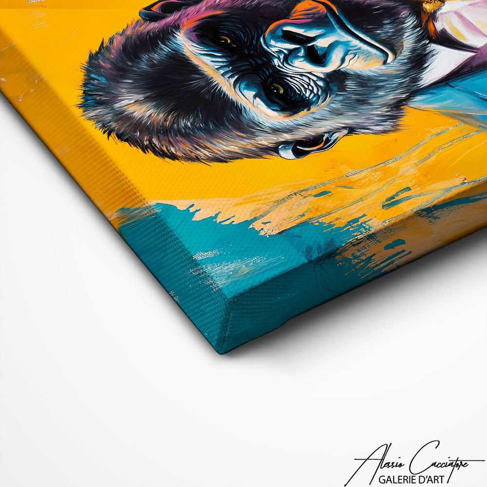 Apportez une touche d'humour et d'élégance à votre espace avec ce tableau gorille en costume. Le contraste entre l'animal majestueux et le costume sophistiqué crée une œuvre à la fois amusante et chic, parfaite pour un décor moderne et original.