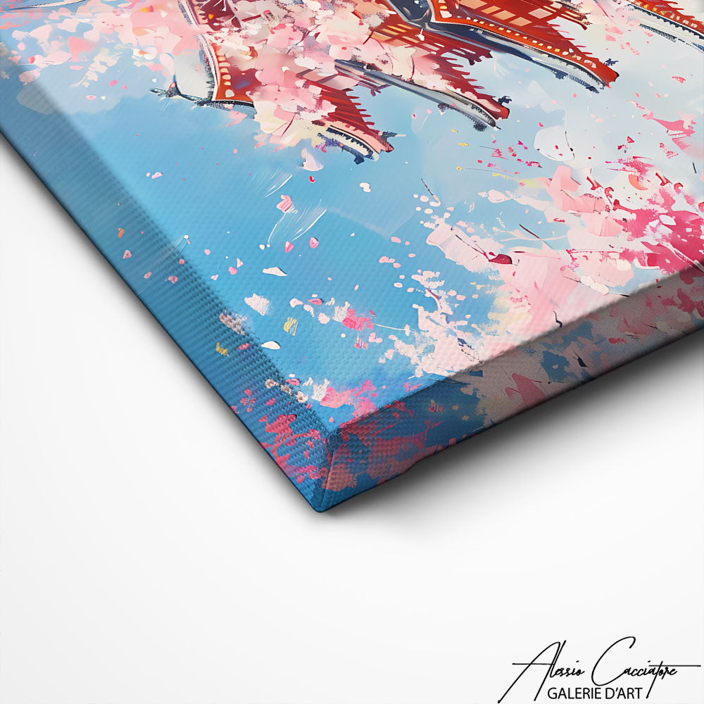 Notre tableau japonais sakura célèbre la beauté d’un temple entouré de cerisiers en fleurs, dans une harmonie visuelle apaisante.