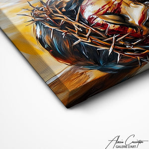 Notre tableau représente Jésus portant la couronne d’épines, dans une composition artistique intense et émotive. Les nuances profondes et les textures picturales renforcent l’expression de recueillement et de spiritualité. Le regard baissé et les détails du visage apportent une grande force visuelle à l’œuvre. Une décoration murale spirituelle qui invite à la contemplation.