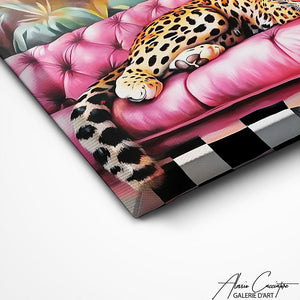 Notre tableau représente un léopard paisiblement allongé sur un canapé rose dans un décor tropical luxuriant. Les couleurs douces et vibrantes créent une ambiance artistique à la fois chic et décalée. La scène mêle élégance, fantaisie et modernité. Une décoration murale parfaite pour apporter une touche pop et audacieuse à votre pièce.