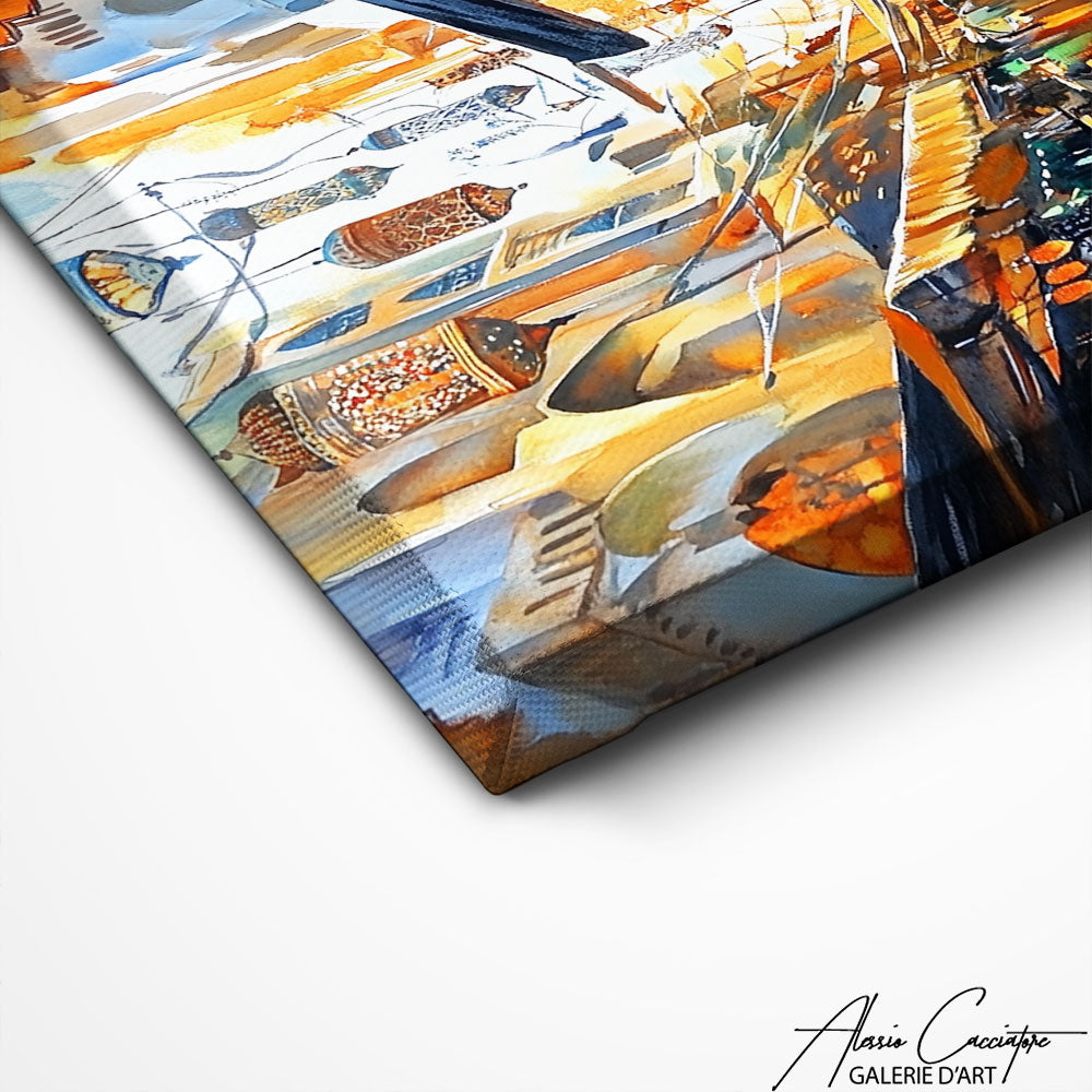 Notre tableau Maghreb vous plonge dans l’ambiance chaleureuse d’un souk traditionnel, où les couleurs riches et les textures authentiques éveillent tous les sens. Chaque scène est pleine de vie : épices, tissus, lanternes et silhouettes se mélangent pour créer une composition vibrante et immersive. Parfait pour donner du caractère à une décoration ethnique ou contemporaine.