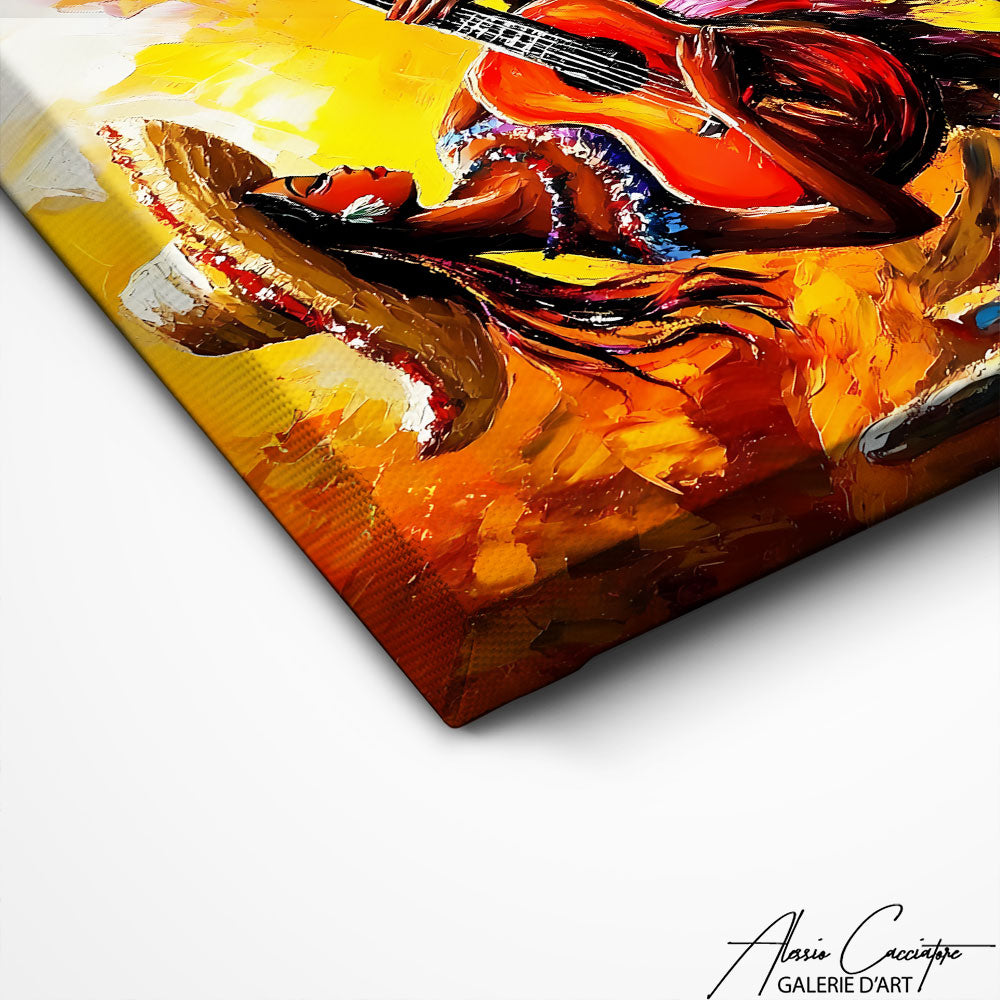 Notre tableau mexicaine moderne rend hommage à la culture vibrante et passionnée du Mexique. Cette œuvre illustre une femme jouant de la guitare sous la chaleur du désert, symbole de liberté et de créativité. Idéal pour apporter chaleur et authenticité à votre décoration murale.