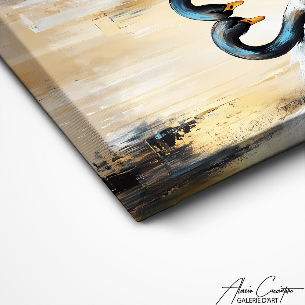 Notre tableau cygnes doré évoque une harmonie parfaite entre élégance et émotion. Les deux cygnes se rejoignant au centre forment un symbole d’amour et de sérénité, sublimé par des reflets dorés et argentés. Idéal pour un salon raffiné ou une chambre apaisante, il crée une ambiance douce et poétique.