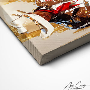 Notre tableau cowboy doré illumine votre espace grâce à ses tons chauds et sa présence luxueuse. Il diffuse une atmosphère chic, idéale pour créer un point d’élégance dans votre pièce. Parfait pour un intérieur contemporain, il s’adapte à tous les styles décoratifs.