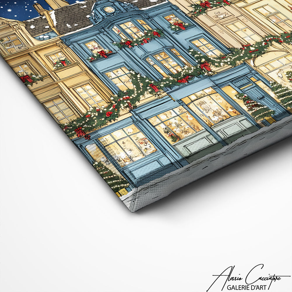 Notre tableau paysage hivernale représente une charmante rue enneigée bordée de maisons colorées décorées pour les fêtes. L’atmosphère douce et poétique de la scène crée un sentiment de sérénité dans votre pièce. Un choix élégant pour sublimer votre environnement.