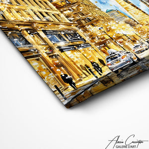 Notre tableau représente une rue de New York illuminée avec la silhouette emblématique de One World Trade Center en arrière-plan. Les lumières dorées de la ville et l’atmosphère hivernale créent une scène urbaine vibrante et élégante. Les reflets sur la chaussée donnent profondeur et mouvement à la composition. Une décoration murale idéale pour les amateurs d’ambiances new-yorkaises.