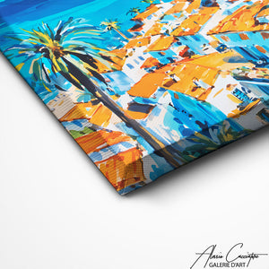 Notre tableau paysage côte d'Azur dévoile un paysage méditerranéen baigné de lumière avec ses toits orangés et la mer azur en arrière-plan. L’ambiance est douce et ensoleillée, parfaite pour créer une décoration élégante et apaisante.