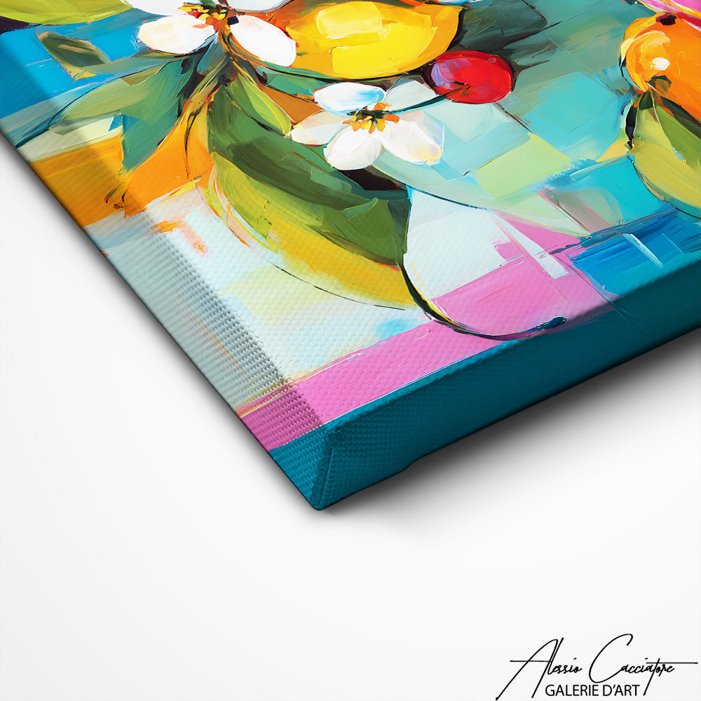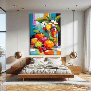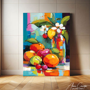 Notre tableau de cuisine moderne mêle des fruits éclatants à une composition abstraite haute en couleur. Une toile pleine de fraîcheur pour dynamiser votre cuisine avec une touche artistique unique. Parfait pour un espace gourmand et joyeux à la fois.