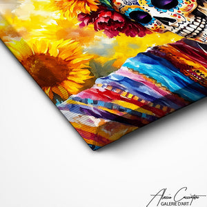 Notre tableau tête de mort coloré revisité dans un style artistique puissant évoque la beauté de la culture mexicaine. Les teintes dorées et les tournesols rayonnants insufflent vie et lumière à ce symbole ancestral. Une pièce décorative forte idéale pour une décoration originale.