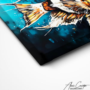 Notre tableau poisson de mer capture la force et la beauté d’un poisson-clown solitaire dans les profondeurs. Son regard perçant et ses détails précis attirent immédiatement l’œil. Les contrastes de turquoise et d’orange apportent relief et intensité à l’ensemble. Parfait pour un espace moderne, notre tableau allie réalisme et style contemporain.