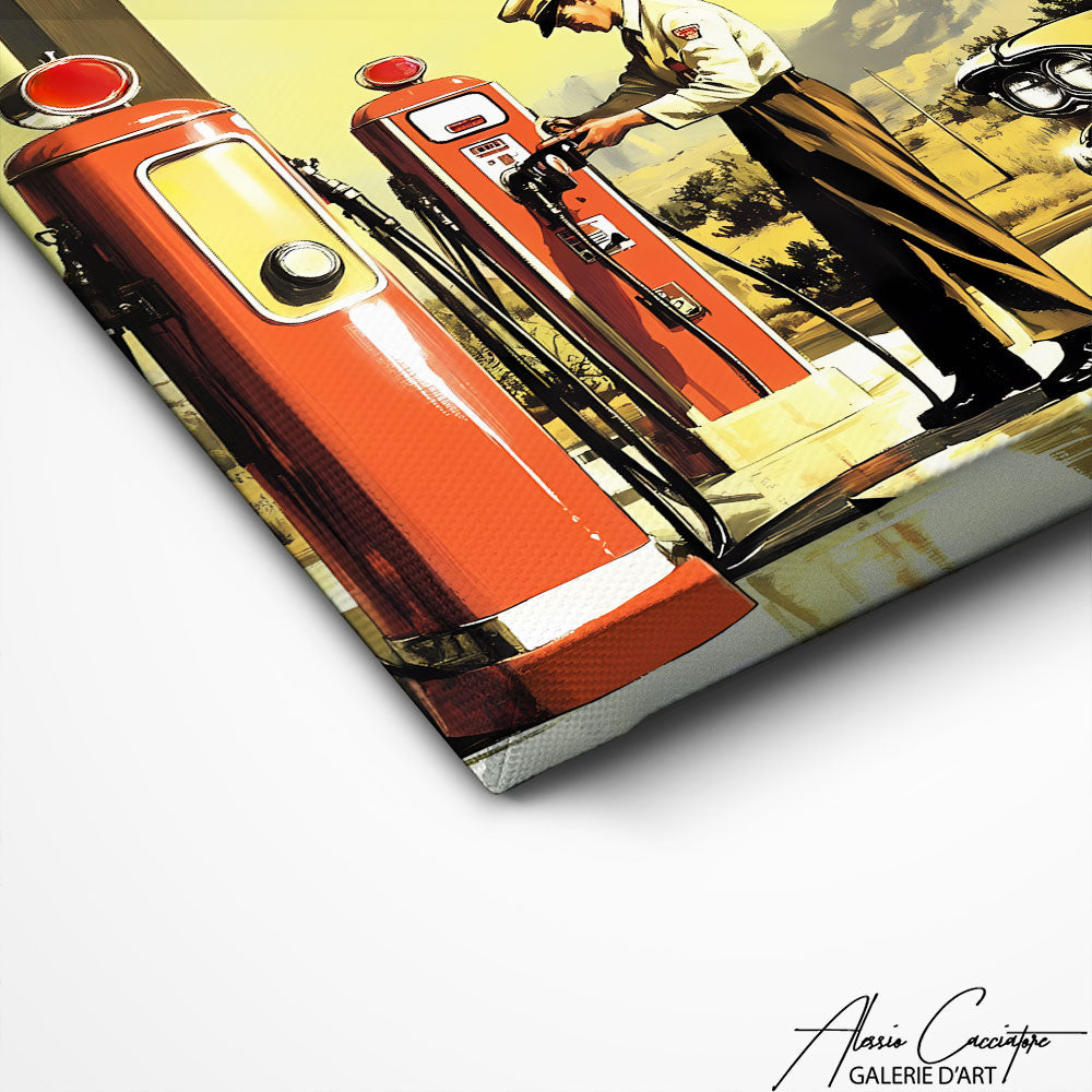 Notre tableau revisite une scène emblématique des années 50, avec une station-service rétro baignée de lumière chaude. La voiture classique et le pompiste en uniforme créent une atmosphère nostalgique et élégante. Une pièce forte qui attire le regard et enrichit instantanément votre décoration intérieure. Idéal pour les passionnés de mécanique, de style vintage ou d'esthétique américaine.