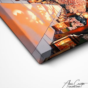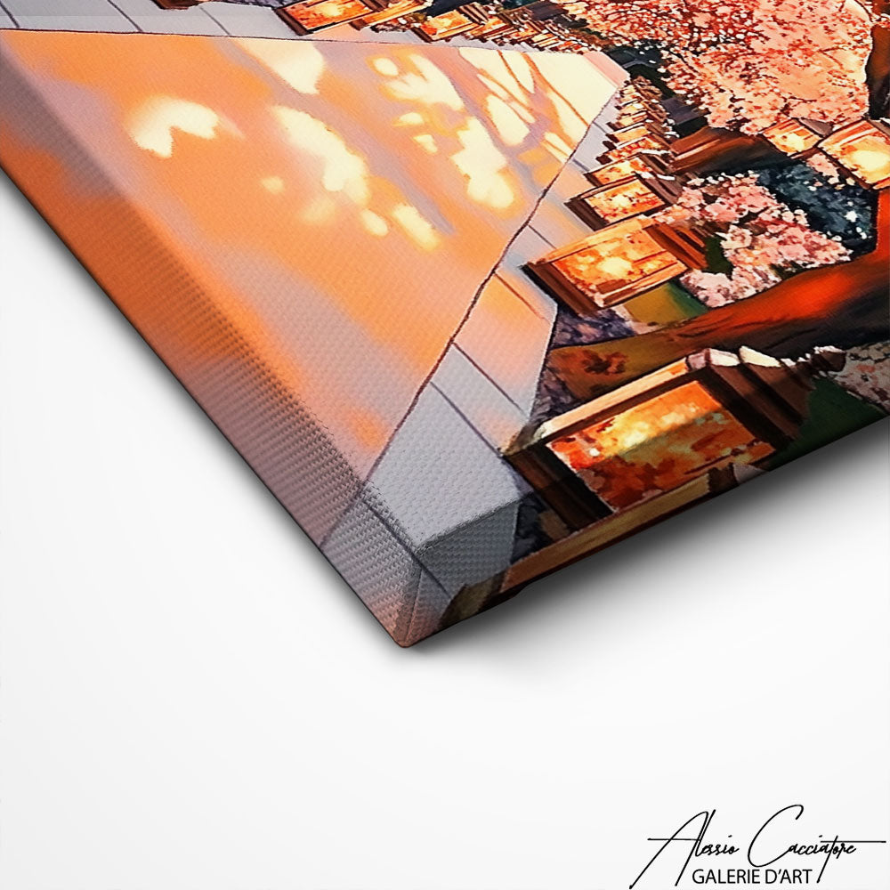 Notre tableau sakura japonais représente une allée de cerisiers en fleurs illuminée par des lanternes chaleureuses. L’ensemble dégage une atmosphère romantique, paisible et immersive qui transforme immédiatement la pièce. Les détails travaillés et la lumière douce invitent à la relaxation et au dépaysement. Une pièce idéale pour créer une ambiance zen et poétique dans votre intérieur.