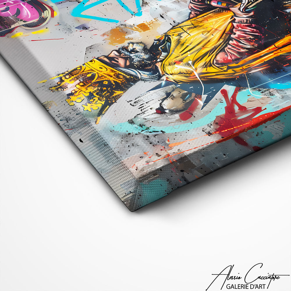 Notre tableau street art montre un SDF avec une couronne, poussé par son caddie dans une scène engagée. Un message fort à accrocher au mur pour une décoration urbaine, provocante et contemporaine. L'œuvre interpelle et invite à la réflexion autant qu’à la curiosité.