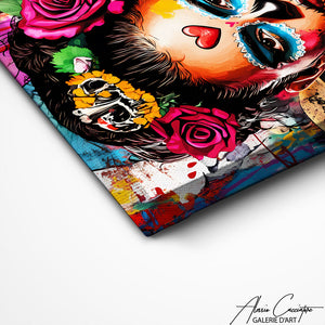 Notre tableau représente un portrait féminin inspiré du style street art avec des couleurs intenses et des motifs expressifs. Les détails du maquillage et les éléments graphiques créent une composition audacieuse et captivante. L’ensemble dégage une forte personnalité visuelle. Idéal pour une décoration moderne et artistique.