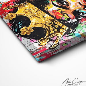 Notre tableau représente un portrait féminin dans un style street art coloré et expressif. Les projections de couleurs et les détails graphiques créent une œuvre vibrante et moderne. Le regard et la posture renforcent la présence visuelle. Parfait pour apporter du caractère à votre décoration intérieure.