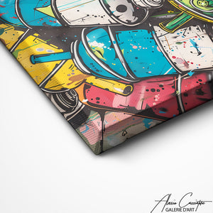Notre tableau street art vertical expose une série de bombonnes colorées dans un décor graffiti énergique. Une œuvre dynamique qui donne vie aux murs et capte tous les regards dans un intérieur urbain. Idéal pour dynamiser une pièce étroite ou un espace en hauteur.