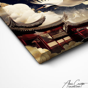 Notre tableau oiseau japandi marie avec finesse la sérénité asiatique et le raffinement contemporain. Une grue blanche s’élève au-dessus d’un temple traditionnel, sous une lune dorée éclatante, symbole de paix et d’harmonie. L’association du noir profond, du beige et de l’or crée une atmosphère zen et luxueuse. Réalisée sur toile haut de gamme, cette œuvre offre une qualité exceptionnelle, parfaite pour un intérieur apaisant et élégant.