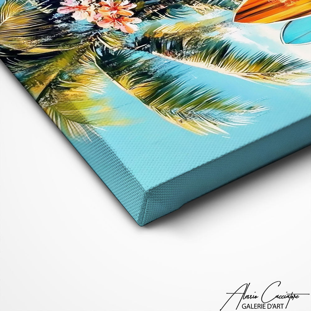 Apportez une énergie estivale à votre intérieur avec notre tableau mettant en scène des planches de surf colorées bordées de fleurs tropicales. Les teintes turquoise, orangées et blanches évoquent un style bord de mer moderne et joyeux, parfait pour une décoration tendance. Conçu avec une finition soignée, il devient rapidement la pièce maîtresse d’une décoration fraîche et ensoleillée.