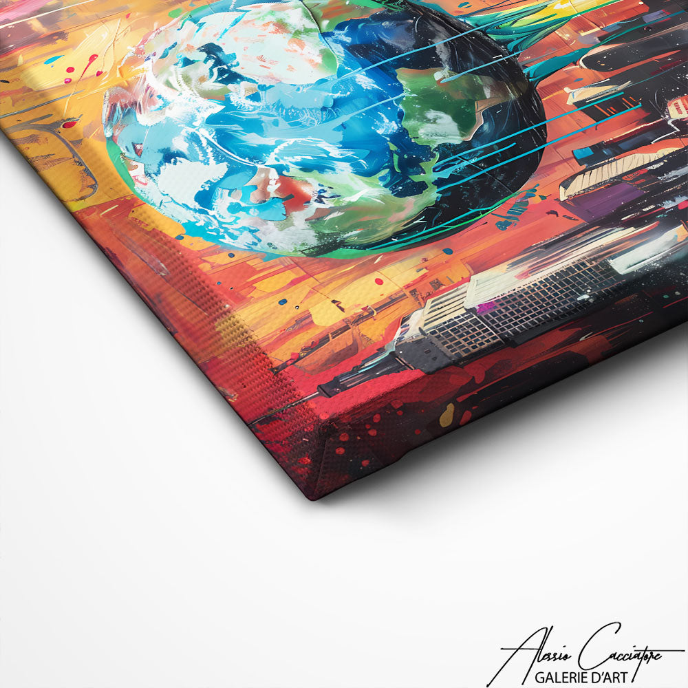 Notre tableau ville futuriste représente une Terre urbaine et saturée de graffitis dans un décor de science-fiction. Une œuvre visuellement forte pour une ambiance avant-gardiste et électrisante. Elle évoque un monde en mutation, entre énergie urbaine et questionnement écologique.