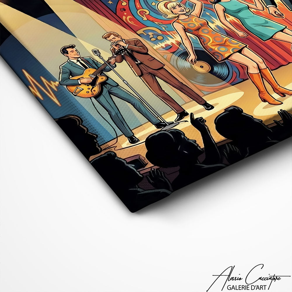 Notre tableau disco vintage capture l’énergie chantante des années 60 avec une scène de spectacle haute en couleurs. Les tenues rétro, les projecteurs et les motifs musicaux donnent une atmosphère joyeuse et dynamique. Sa composition pleine de mouvement en fait une pièce décorative idéale pour un espace créatif ou une chambre inspirée par l’esprit rétro.